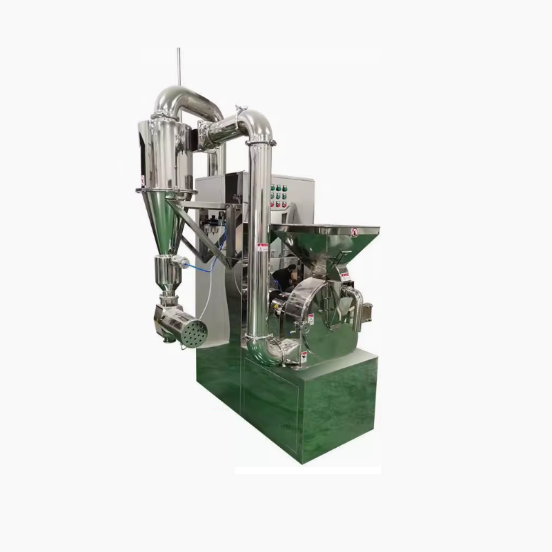 该机由加料斗,筛网,粉碎刀片,齿圈,粉碎电机,出料口,风叶,集料箱,吸尘箱等部分组成,物料由加料斗进入粉碎室,通过高速旋转的刀片进行粉碎,更换不同型号的筛网来达到所要求的物料细度,高速旋转的风叶把达到要求的物料从粉碎室引到集料箱布袋中,没有达到要求的物料继续在粉碎室中粉碎,集料箱布袋产生的粉尘由吸尘箱收集,该机组按“GMP”标准设计,结构简单,操作清理方便,噪音小,产量高,机器采用不锈钢材料制作,粉碎过程中无粉尘飞扬。
